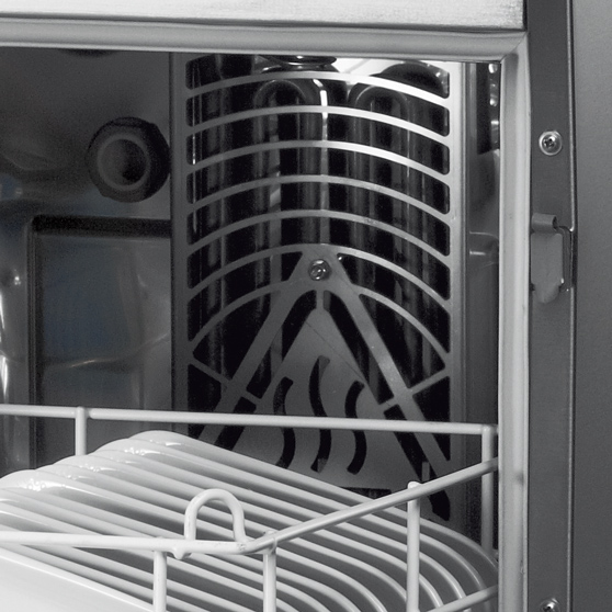 PREMAX GCP er den første kommersielle glassoppvaskmaskinen i verden med integrert tørking. Varm og tørr luft fjerner fukten fra glassene og kanaliserer den ut av vaskekammeret. Manuell tørking hører dermed til fortiden.