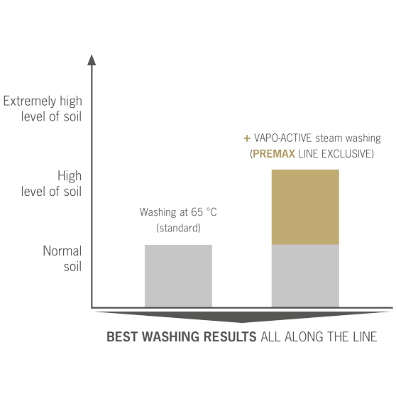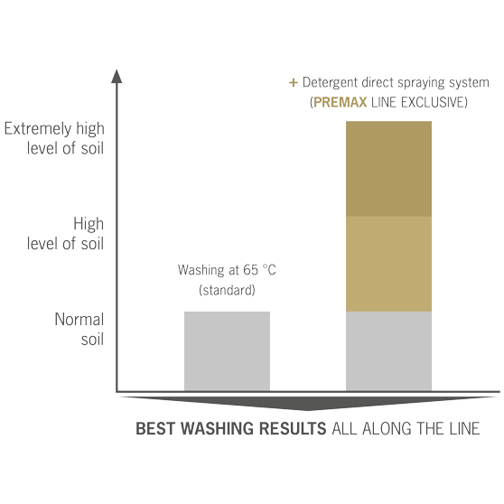 Ekstrem smuss krever vanligvis intensivt manuelt forarbeid før det kan plasseres i oppvaskmaskinen. For å få et optimalt vaskeresultat, med et minimum av manuelt forarbeid, benytter PREMAX oppvaskmaskiner damp for å forbedre effektiviteten. Med dampvask løsnes inntørkede matrester av eggehvite og stivelse fra vaskegodset. I det unike bestikkprogrammet med damp, trenger ikke kniver, gafler, skjeer osv. vaskes to ganger.