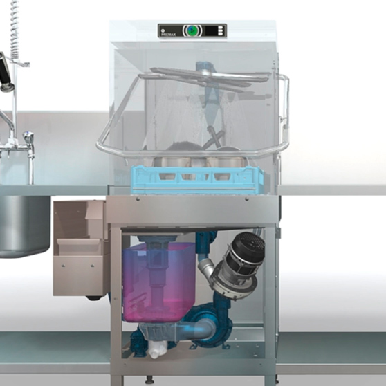 ASR – innebygd forspyling – reduserer vesentlig behovet for manuell forspyling, sparer vann samt minimerer utskiftning av vann i HOBART hettemaskiner. Matrester pumpes direkte til en separat silkurv utenfor oppvaskmaskinen, og av den grunn skitnes ikke oppvaskvannet til.