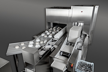 Systemet består av en automatisk sorteringsenhet, en FTNi-båndmaskin for brett og bestikk og en ekstra bred FTNi-båndmaskin med et separat fingerbånd for skåler og tallerkener.